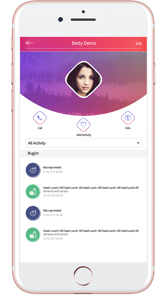 Parents can see the meal menü added by the school and receive notifications about what the student has eaten together with all the activites s/he has participated in once the teacher checks-in.